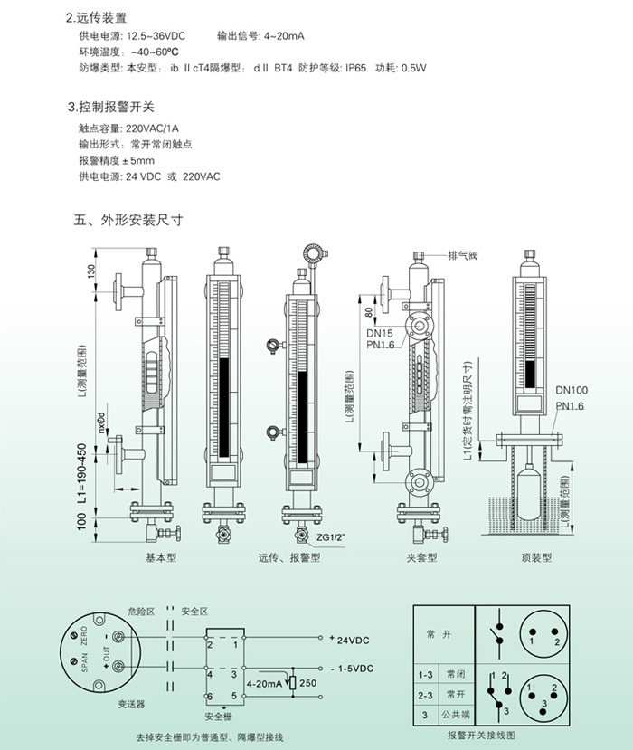 l 上下限開關輸出 利用磁性浮子隨液位移動,使安裝在液位計立管設定位置的簧片開關動作,實現 ON-OFF 控制或報警。