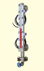 在您選用此產(chǎn)品前我們先將側(cè)裝式翻柱控制液位計的工作原理作一簡單的介紹:它有一容納浮球的腔體我們稱其為主體管或外殼,它通過法蘭或其他接口與容器組成一個連通器;這樣它腔體內(nèi)的液面與容器內(nèi)的液面是相同高度的,所以腔體內(nèi)的浮球會隨著容器內(nèi)液面的升降而升降;這時候我們并不能看到液位,所以我們在腔體的外面裝了一個翻柱顯示器,因為我們在制造浮球時在浮球沉入液體與浮出部分的交界處安裝了磁鋼,它與浮球隨液面升降時,它的磁性透過外殼傳遞給翻柱顯示器,推動磁翻柱翻轉(zhuǎn)180°;由于磁翻柱是有紅、白兩個半圓柱合成的圓柱體,所以翻轉(zhuǎn)180°后朝向翻柱顯示器外的會改變顏色(液面以下紅色、以上白色),兩色交界處即是液面的高度。 控制型是在翻柱液位計的基礎上增加了磁控開關(guān),在監(jiān)測液位的同時磁控開關(guān)信號可用于對液位進行控制或報警;遠傳型是在翻柱液位計的基礎上增加了4~20mA 變送傳感器,在現(xiàn)場監(jiān)測液位的同時將液位的變化通過變送傳感器、線纜及儀表傳到控制室,實現(xiàn)遠程監(jiān)測和控制。