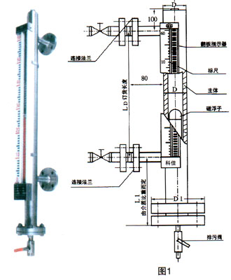 UZ-AF型側裝型磁性翻板液位計(圖1所示)是以浮子內磁鋼驅動雙色薄片的翻轉來指示液位的一種新型儀表.主體內磁浮子隨液位的升降而上下運動,同時驅使主體外指示器內的雙色薄片翻轉,有液位時轉示紅色、無液位時轉示黑色。紅色和黑色色帶間的界線即代表液位高度。在指示器左側配有醒目的刻度標尺,從而使液位的指示顯得更加清晰。